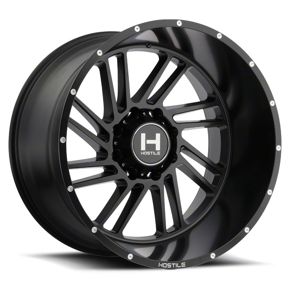 Hostile Stryker Asphalt 8-Lug Wheel; 24x14; -76mm Offset offers a sleek and assertive aesthetic that enhances a vehicle's visual presence. Its gloss black finish amplifies the appeal, making it a great match for bold styling themes. This wheel brings a refined edge to any build while maintaining a confident stance on the road. Crafted to elevate the appearance of a wide range of vehicles.