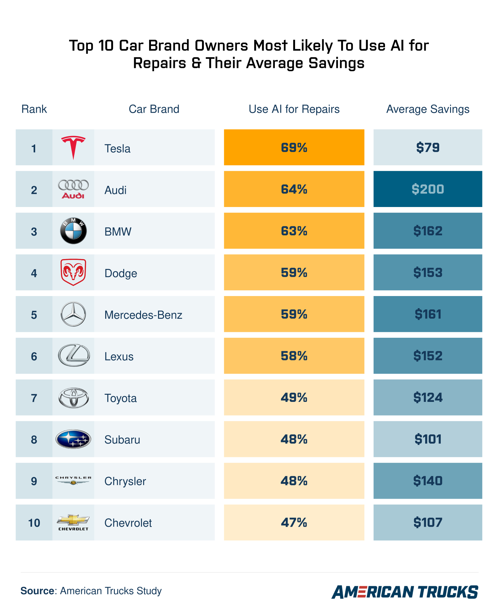 - Tesla owners are most likely to use AI for car repairs, saving $79 on average.