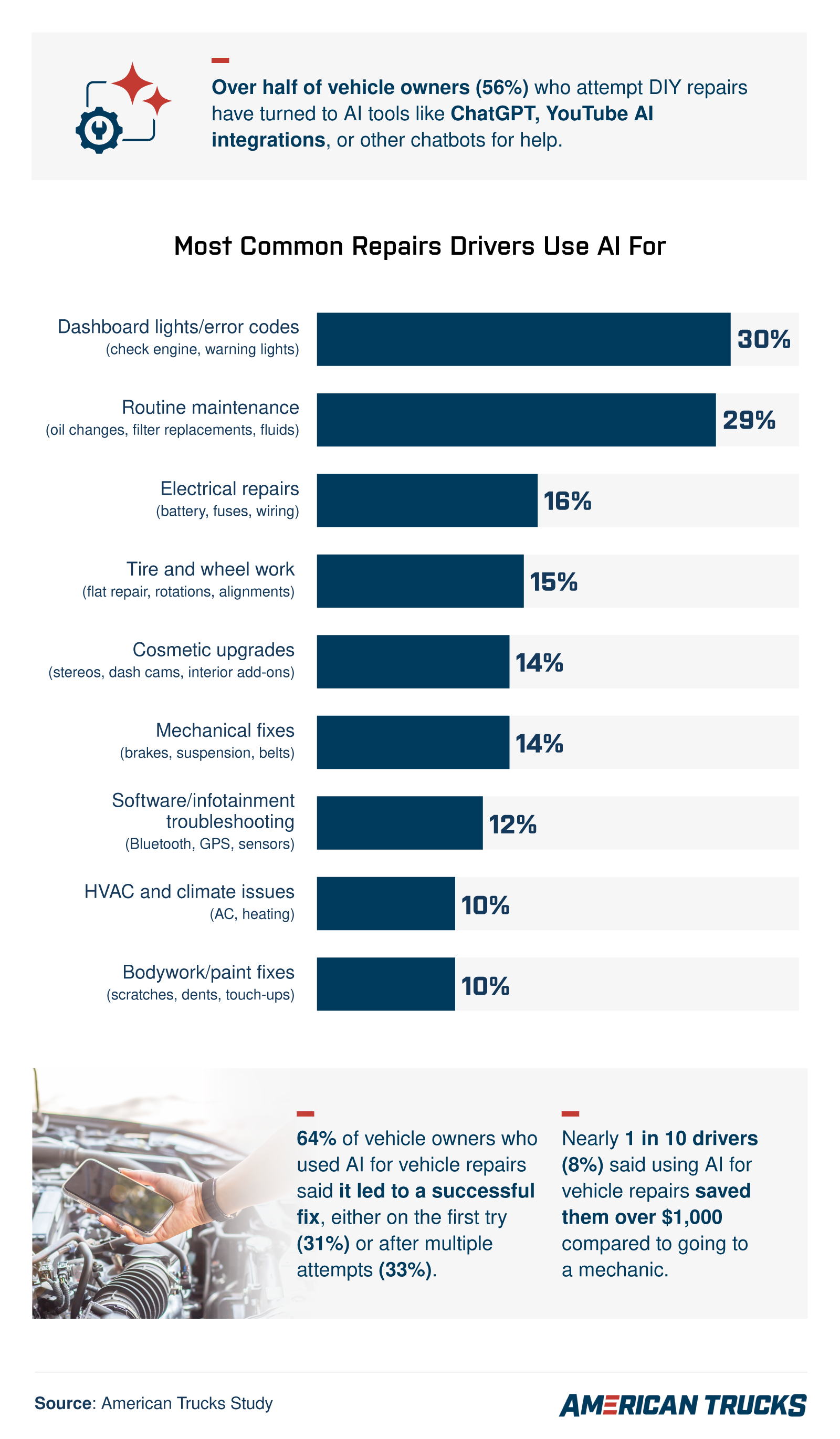 - 56% of vehicle owners who attempt DIY repairs have turned to AI chatbots for help.