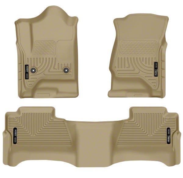 Application. These Husky WeatherBeater Front and Second Seat Floor Liners; Footwell Coverage; Tan are designed to fit 2015-2019 GMC Sierra 2500 HD Crew Cab models.