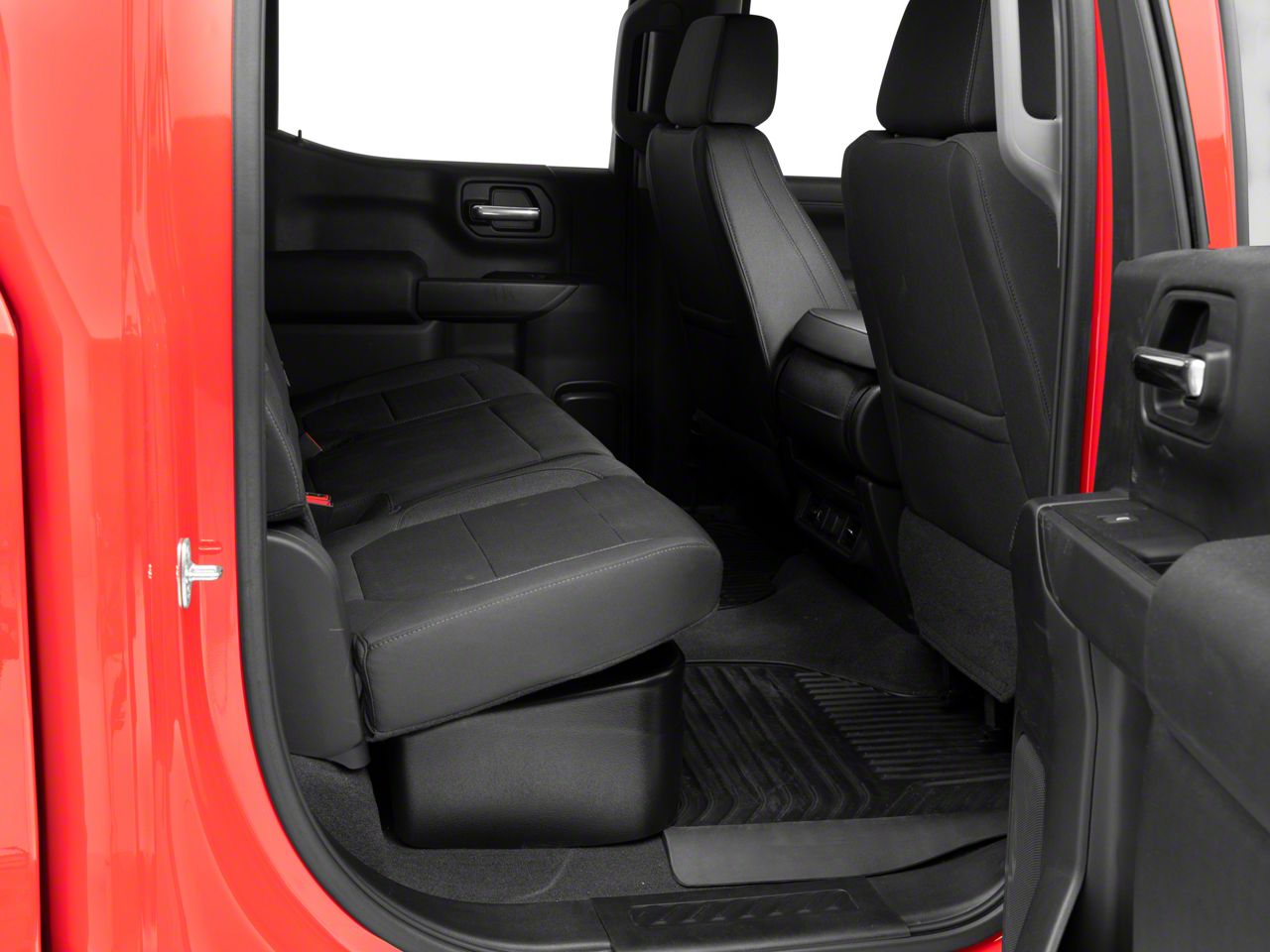 Functional Storage. Your Silverado 1500 has plenty of bed space, but what do you do for interior storage? A Husky Gearbox Under the Seat Storage Box; Black is the perfect solution to your in-cab storage needs. With an impact-resistant, rubberized outer shell that gives a sleek factory look, this rear storage holder can hold all of your loose items. The non-skid inside surface minimizes shifting and noise while keeping loose items in a secure place. The cargo box comes with removable dividers, making it easy for you to customize your box into compartments.