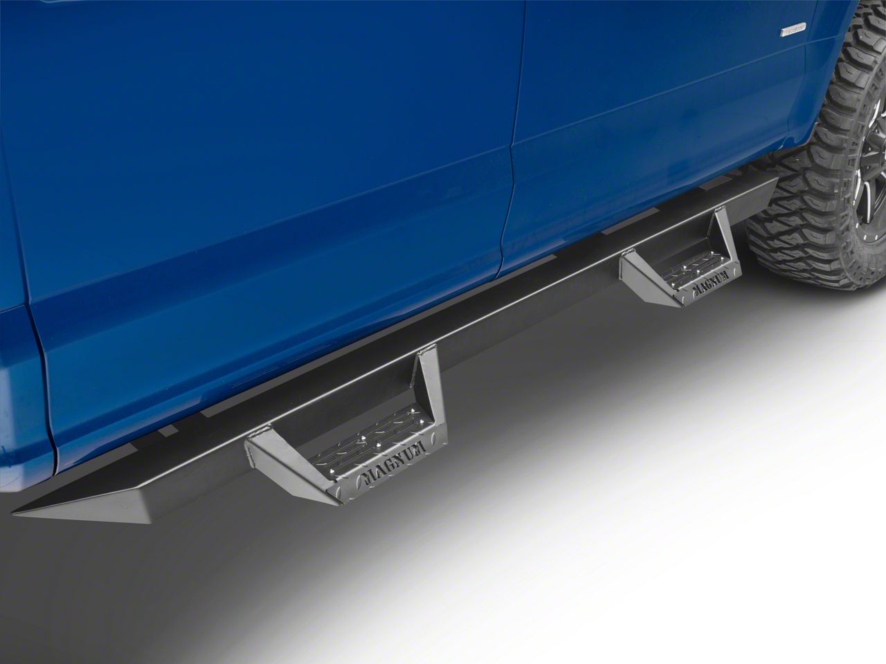 Rugged Convenience. Adding step bars to your truck gives you the ultimate bang for your buck. Magnum RT Cab Length Side Step Bars – Black are the heavy duty solution. They provide convenient stepping points to access the cab, they provide rugged protection to the sides of your truck's cab, and they add to the aggressive off-road appearance of your F-150.