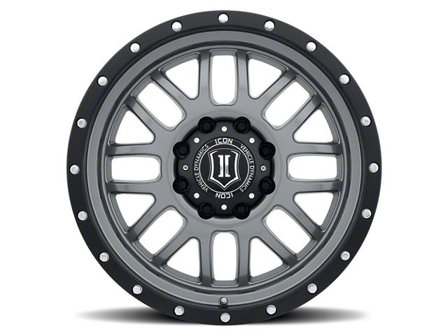 The 20x9 ICON Alloys Alpha Gunmetal 8-Lug Wheel is completed in a high-quality gunmetal gray finish, which looks great. Thanks to a durable clear coat, the finish also protects against the rigors of driving.