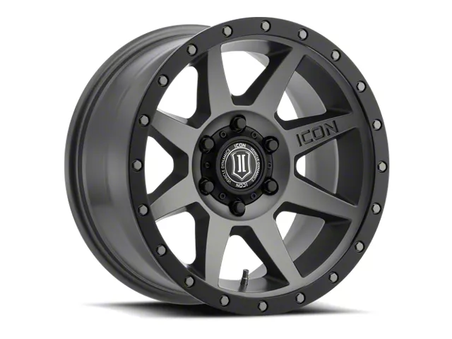 ICON Alloys Rebound Titanium 6-Lug Wheel; 17x8.5; 0mm Offset exudes a sleek aesthetic appeal, complementing a range of vehicle styles. Its dark stainless finish emanates sophistication, while the brand reputation of ICON Alloys ensures robustness. This wheel seamlessly merges elegance with durability.