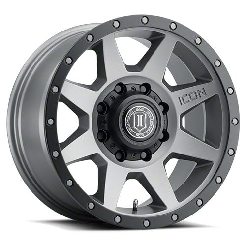 ICON Alloys Rebound Titanium 8-Lug Wheel; 20x9; 12mm Offset offers a striking balance between style and durability. The design speaks to the brand's commitment to quality, enhancing the vehicle's appearance with its distinct look. This wheel, with its unique aesthetics, is ideal for drivers who appreciate a blend of modern design and robust functionality.