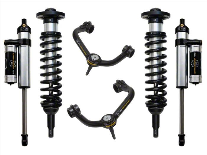 Adjustable Lift for Enhanced Performance. The ICON Vehicle Dynamics Suspension Lift System provides an adjustable front lift ranging from 0 to 2.63 inches, delivering improved ground clearance and accommodating larger tires. Ideal for both on-road and off-road performance, this system offers a versatile solution for your F-150.