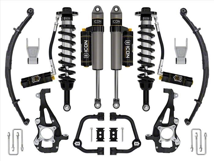 Enhanced Suspension Performance. The ICON Vehicle Dynamics 3.50 to 4.50-Inch Suspension Lift System with Tubular Upper Control Arms and Leaf Pack is designed to significantly increase your vehicle's ride height. This Stage 4 system enhances both off-road performance and on-road handling, allowing for the installation of larger, more aggressive tires.