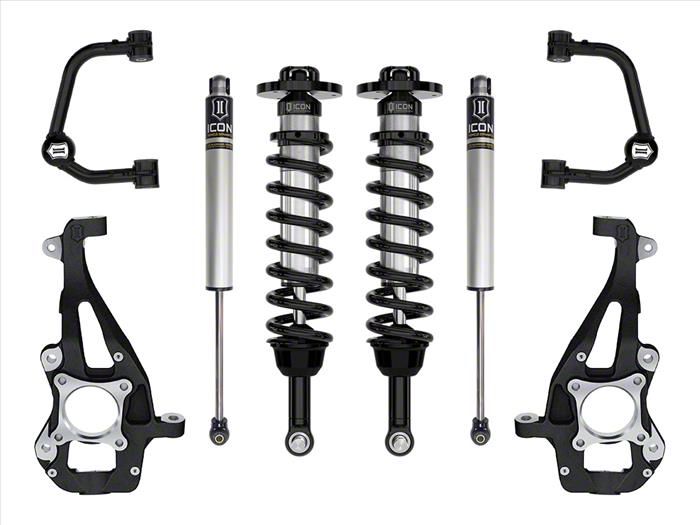 Adjustable Suspension Lift System. The ICON Vehicle Dynamics 3.50 to 4.50-Inch Suspension Lift System with Tubular Upper Control Arms allows for an adjustable lift height from 3.5 to 4.5 inches. This system includes ICON vehicle-specific tuned 2.5-inch coilover shocks with an internal reservoir for improved cooling, providing superior performance and durability.