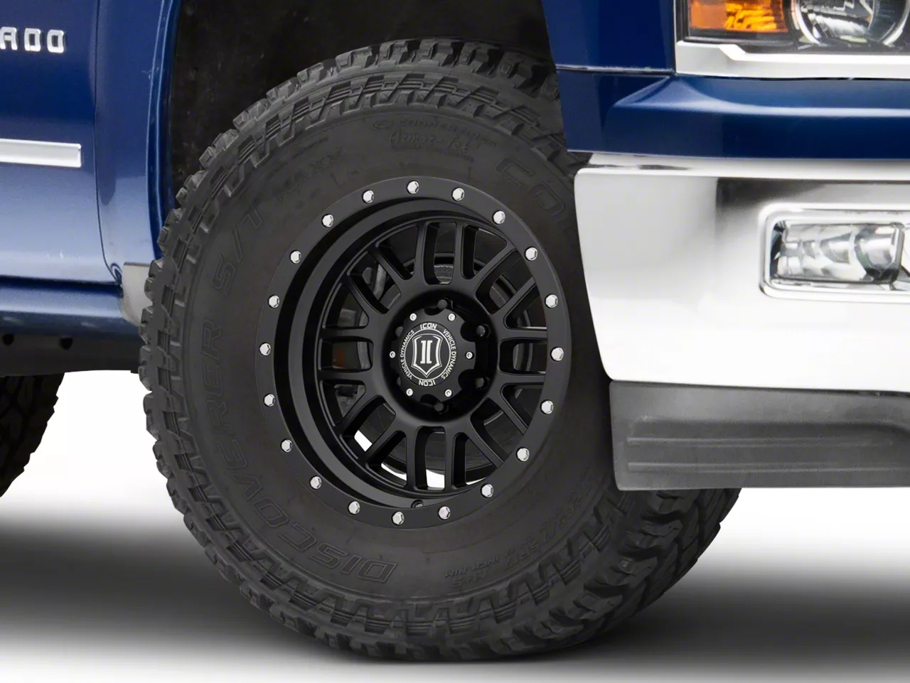 Application. This ICON Alloys Alpha Satin Black 6-Lug Wheel; 17x8.5; 0mm Offset, with a backspace of 4.75 Inch, 120.7mm and bolt pattern of 6 x 139.7mm (6 x 5.5-Inch), ensures proper alignment and stability. It's designed to fit the 2014-2018 Silverado 1500 models, enhancing both the look and the overall driving experience. Sold individually.