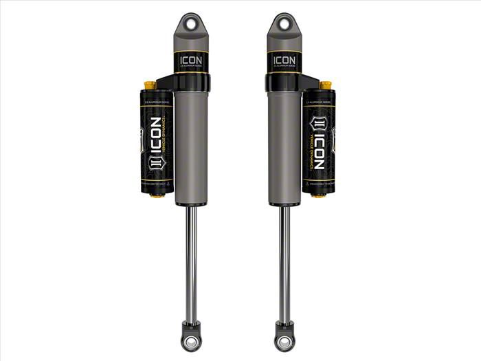 High-Performance Rear Shocks. The ICON Vehicle Dynamics V.S. 2.5 Series Rear Piggyback Shocks with CDCV are designed to provide superior performance for your vehicle, whether on or off the road. These shocks are ideal for vehicles lifted up to 2 inches, offering precise control and outstanding damping capability.