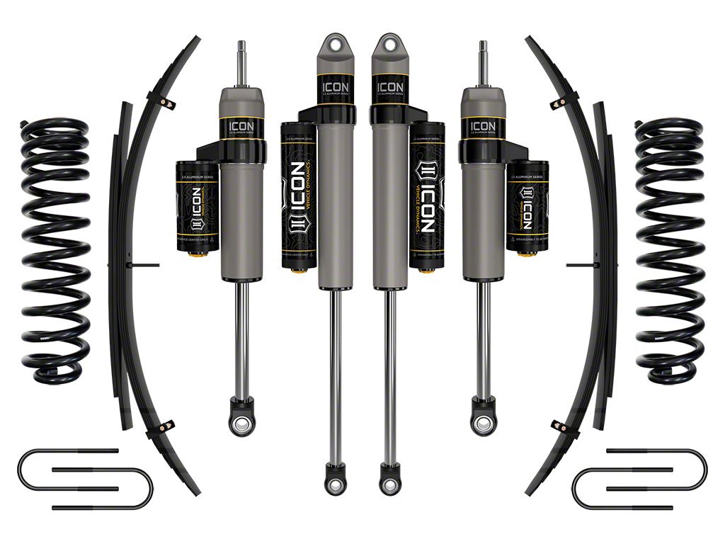 Advanced Suspension Performance Lift. The ICON Vehicle Dynamics 2.50-inch Suspension Lift System with Leaf Spring Expansion Packs is designed for 2008 to 2010 4WD 6.4L Powerstroke F-250 Super Duty trucks, delivering increased ride height, wheel travel, and suspension capability. This system is ideal for owners looking to upgrade ride quality without compromising towing or payload performance, and it's engineered to reduce body roll while maintaining on-road comfort and off-road control.