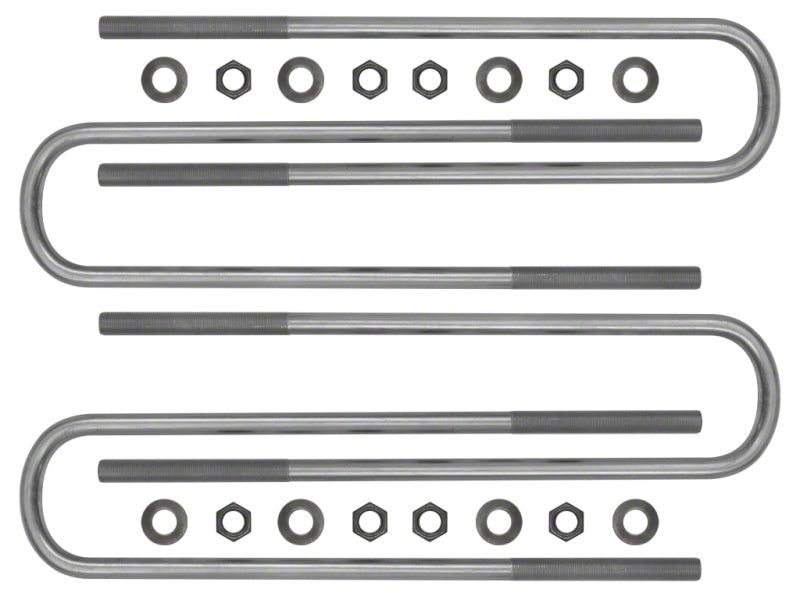 Construction and Appearance. Crafted using high-strength grade 8 steel hardware, these square u-bolts are built to withstand heavy loads, repeated stress, and demanding driving conditions. The polished chrome finish provides a clean, professional appearance while also helping resist corrosion and surface wear over time. With a 17-inch length and a design intended to support a 0.75-inch lift, the u-bolts are manufactured to deliver consistent clamping force and proper fitment when used with compatible suspension configurations. Included washers and nuts are matched to the hardware for secure and even load distribution.