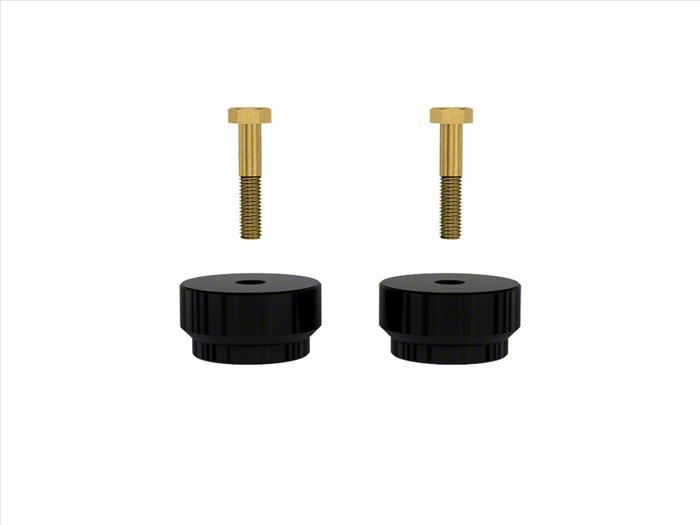 Description. ICON Vehicle Dynamics bump stop spacers are an easy and clean looking way to lower the front bump stops on a 2005-2022 Ford Super Duty. These CNC machined aluminum spacers lower the bump stop 1” and limit suspension travel to allow for fitment of steering stabilizer kits, other aftermarket suspension parts, or even just to prevent rub from oversized tires.