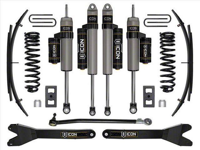 Description. This ICON Vehicle Dynamics 2.5” suspension system is a great way to lift your 4WD 2023 Ford F-250/F-350 Super Duty while drastically improving ride quality and performance. The Stage 3 system is perfect for on-road and off-road use including towing, job site duty and general off-road adventure. ICON's Stage 3 System is comprised of dual rate coil springs, fabricated radius arms, on-vehicle adjustable front track bar, rear leaf spring expansion packs with blocks and U-bolts for a more compliant ride and reduced axle wrap, and ICON 2.5 Aluminum Series front and rear piggyback reservoir shocks. This stage sees the inclusion of the ICON Vehicle Dynamics Ford Super Duty Radius Arm System that feature a sealed pivot bushing that minimizes road feedback and ensures a long life and quiet operation. Additionally, their fabricated, fully boxed design ensures strength and utilizes a profile optimized for tire clearance at full steering lock, making a 37” tall tire clear without coming in contact with the radius arm. With the endless hours ICON has spent testing and tuning our suspension components and shocks as a complete package, you can rest assured you have the best suspension solution on the market.