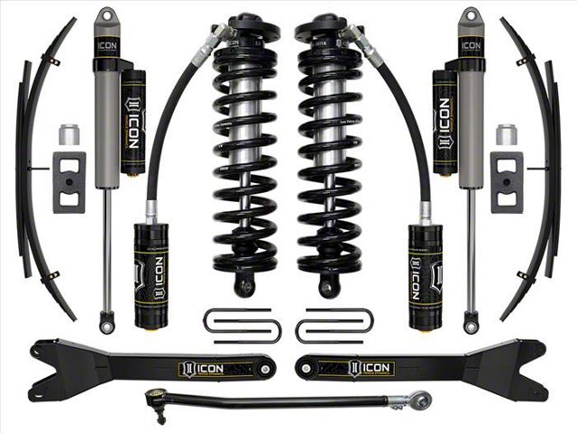 Description. This ICON Vehicle Dynamics 2.5-3” coilover system is a great way to lift your 4WD 2023 Ford F-250/F-350 Super Duty while drastically improving ride quality and performance. The Stage 3 system is perfect for on-road and off-road use including towing, job site duty and general off-road adventure. The advantage of utilizing a coilover conversion kit is that they have been designed to increase the overall damping ability of the vehicle while at the same time allowing for user-defined ride height adjustment. The 2.5" Remote Reservoir Coilover featured in these kits is based off of ICON’s 2.5 VS Series shock line - meaning that features like ICON engineered coil springs, FK Rod End bearings, and vehicle-specific valving come standard. ICON's Stage 3 System is comprised of ICON 2.5 Series remote reservoir coilovers with adjustable ride height, fabricated Radius arms, rear leaf spring expansion packs with blocks and U-bolts for a more compliant ride and reduced axle wrap, and ICON 2.5 Aluminum Series piggyback reservoir rear shocks. This stage sees the inclusion of the ICON Vehicle Dynamics Ford Super Duty Radius Arm System that feature a sealed pivot bushing that minimizes road feedback and ensures a long life and quiet operation. Additionally, their fabricated, fully boxed design ensures strength and utilizes a profile optimized for tire clearance at full steering lock, making a 37” tall tire clear without coming in contact with the radius arm. With the endless hours ICON has spent testing and tuning our suspension components and shocks as a complete package, you can rest assured you have the best suspension solution on the market.