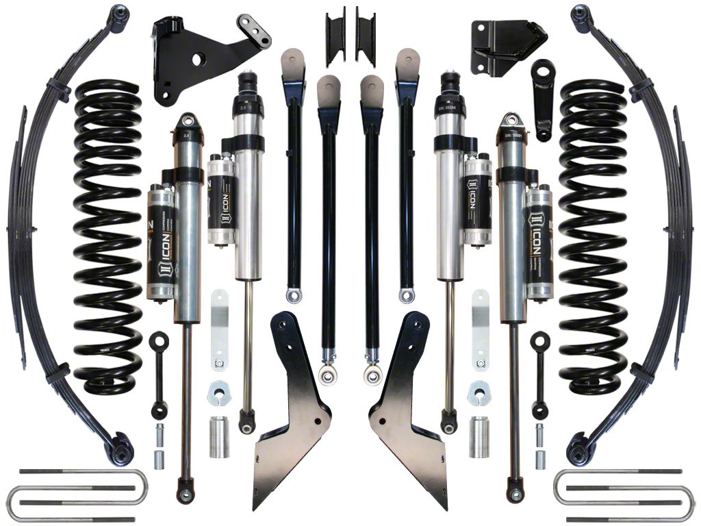 ICON Vehicle Dynamics is an industry leader when it comes to Ford Super Duty performance. Our engineers have spent countless hours under these trucks and behind the wheel developing some of the most refined suspension systems available. Increasing wheel travel and ride comfort is standard operating procedure at ICON, but our engineers aimed high to produce a suspension solution that also maintained the Super Duty’s towing capacity. ICON’s 7” Suspension System for the 08-10 Super Duty yields enough lift to clear 37” tires while providing excellent ride characteristics across a wide variety of terrain on and off-road. Each component of this suspension system has been specifically engineered to work in union with other ICON parts to extract maximum performance out of the vehicle. Our Stage 5 System is comprised of 7” lift dual rate coil springs, fabricated radius arm drop mounts with brushed stainless badges, track bar drop bracket, bump stop extensions, sway bar links, a forged pitman arm, brake line brackets, rear 5" lift progressive rate leaf springs w/ U-bolts, and 2.5 Aluminum Series piggyback reservoir front & rear shocks. 2.5" reservoir shocks ensure optimum performance by increasing the duration of consistent damping regardless of situation, keeping the shocks at a cooler operating temperature during heavy use. The ICON CDC Valve upgrade is included in this stage for those desiring an easy way to tune the ride externally. ICON’s adjustable 4 link system is not only stronger than the factory radius arms, but will enhance performance and improve wheel alignment. These link arms eliminate bind commonly found in the factory radius arms, while increasing the suspension's range of motion.