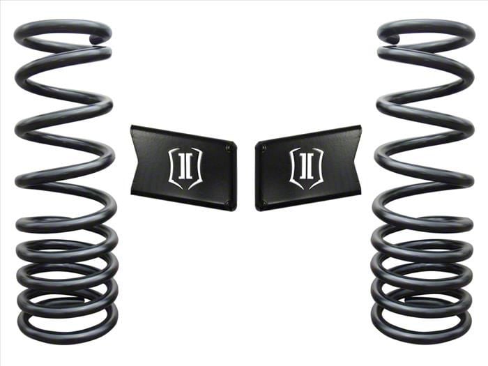 Enhanced Suspension Performance. The ICON Vehicle Dynamics 4.50-Inch Front Dual Rate Lift Springs provide a significant lift height of 4.50 inches. These springs feature dual-rate technology, offering a softer initial rate for superb on-road comfort and an increasing firmer secondary rate for excellent bottoming resistance and off-road performance. They improve wheel travel, level the stance, and allow for larger tires, making them an essential upgrade for your vehicle.