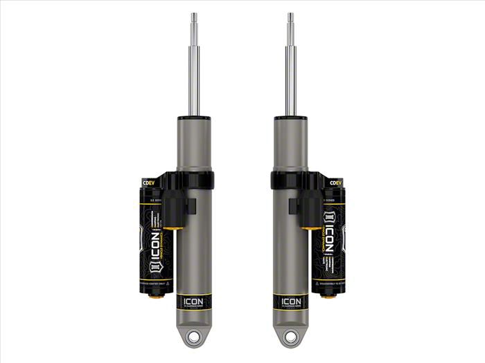 Smooth and Controlled. Upgrade your vehicle's rear suspension with the ICON Vehicle Dynamics V.S. 2.5 Series Rear Piggyback Shocks with CDEV. Designed to work with stock heights, these shocks come in a pair and feature the innovative CDEV technology, which regulates the oil flow to adjust the amount of damping force produced when a shock is compressed. Moreover, the shocks’ non-adjustable design ensures consistent performance and prevents bottom outs, making it ideal for both on and off-road driving.