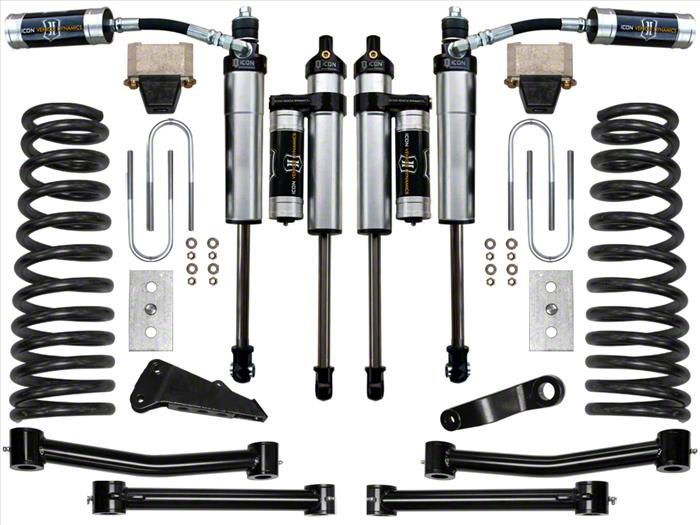 Description. 2009-2012 Ram 2500/3500 4.5" Stage 3 Suspension System utilizes the same technology as the 2.5" systems while adding lift height and ground clearance. Additional engineered front end components are added to ensure proper steering geometry with improved function throughout the entire travel range whether on or off road. The Stage 3 System is comprised of dual rate coil springs, tubular steel upper & lower link arms, polyurethane bumpstops w/ billet extension, sway bar drop brackets, forged pitman arm, track bar drop bracket, 2.5" V.S. Series shocks, rear 2.5" lift blocks with u-bolts. ICON 2.5" Series shocks extend the performance of the kit by increasing the duration of consistent damping regardless of situation. These shocks include FK bearings, billet top cap & rod ends, 7/8" shafts for strength, and the industry only forged stem on a 2.5" shock with rolled threads. ICON steel upper & lower links increase performance, strength, and range of alignment. These link arms decrease the bind found in the factory link bushings. This mid-level performance system with billet link arms is great for towing, rough construction site terrains, and country dirt roads all while keeping a smooth highway feel. Installing this kit allows proper clearance for 35" tall tires with no modifications, and some 37" tires with minor fender well trimming for clearance. With the endless hours ICON has spent testing and tuning our suspension components and shocks together, you can rest assured you have the best suspension solution on the market.