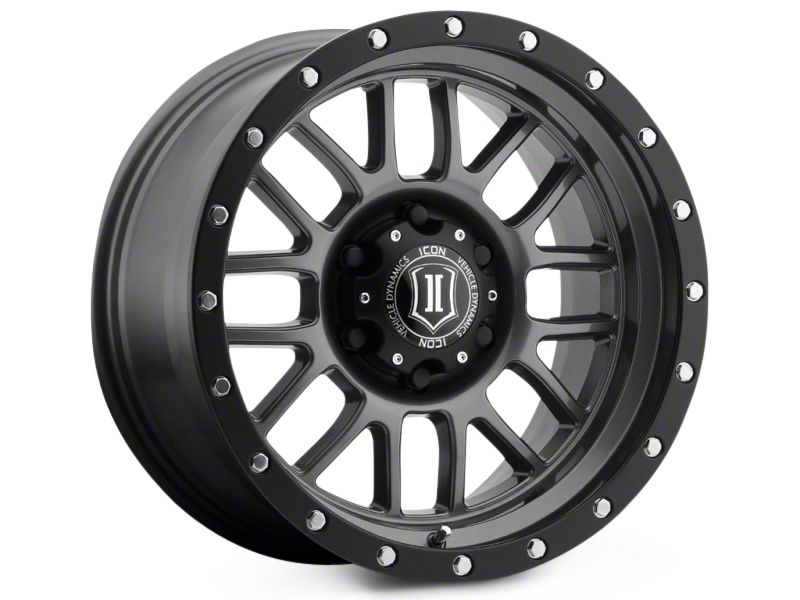 The 17x8.5 ICON Alloys Alpha Gunmetal 6-Lug Wheel is completed in a high-quality gunmetal gray finish for an aggressive appearance that will make others green with envy. For added protection and good looks, a clear coat is added.