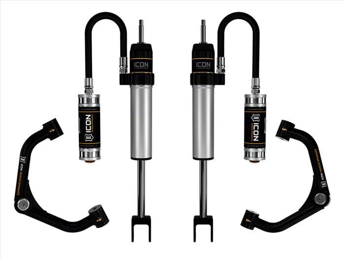 Enhanced Suspension Performance. The ICON Vehicle Dynamics V.S. 2.5 Series Remote Reservoir Shock System is designed to improve ride quality and handling for vehicles with up to 2 inches of lift. Engineered for the front axle, this shock system provides increased damping force and stability, helping to prevent bottoming out on rough terrains.