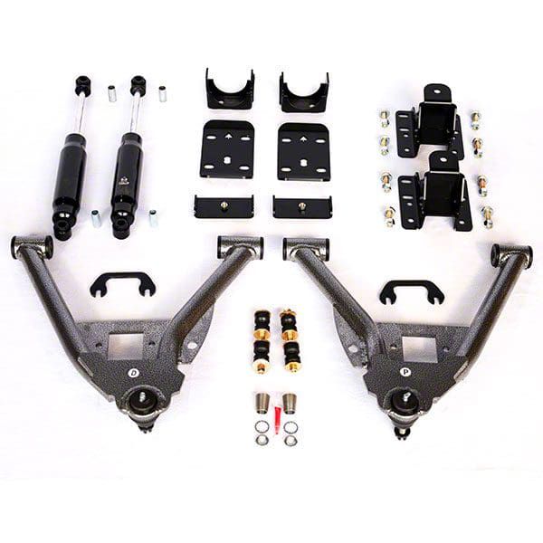 Construction and Appearance. The kit incorporates high-quality rear shocks/struts and utilizes a flip primary rear lowering component kit. It uses lower control arms as the primary front-lowering component and is paired with all the necessary installation hardware. Made to meet or exceed industry-leading quality and safety standards, it offers application- and vehicle-specific properties.