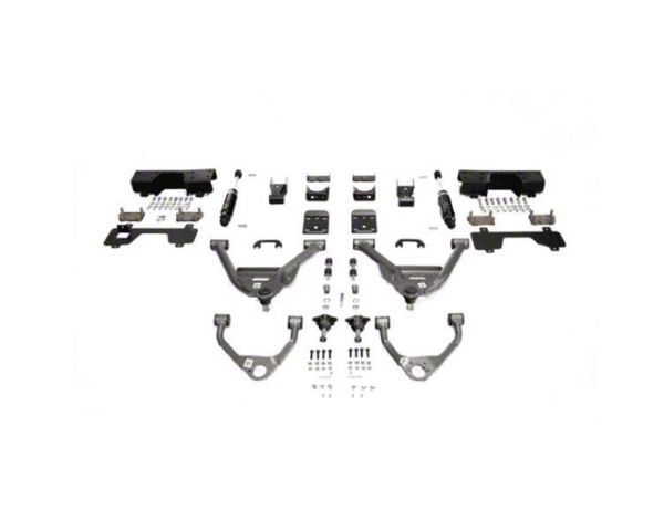 Construction and Appearance. Featuring a raw metal and matte black finish, this lowering kit is crafted from high-quality materials to ensure durability and longevity. The kit includes a Bolt-On C-Notch, upper and lower control arms, spacers, sway bar links, lowering shackles, a flip kit, and Grade 8 hardware, all designed to meet OEM standards and perform under demanding conditions.