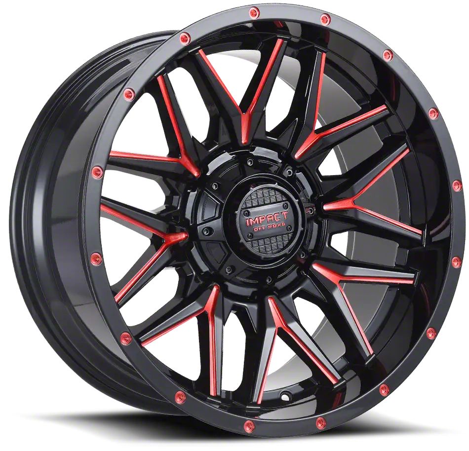 Impact Wheels 819 Gloss Black and Red Milled 6-Lug Wheel; 17x9; 0mm Offset: Immerse your vehicle in style and elegance with this wheel's captivating matte black finish. The unique 10-hole design of this Mammoth wheel sets your vehicle apart, making a statement on the road. Whether cruising the city streets or heading out for a weekend escape, this wheel complements a wide range of vehicle styles.