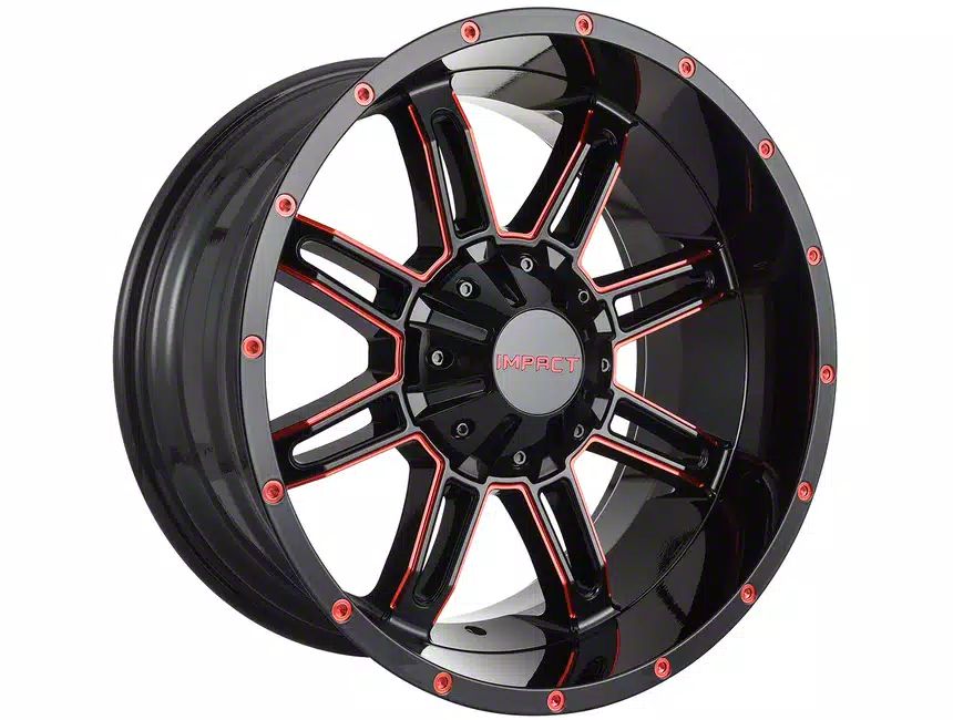 The 20x10 Impact Wheels 805 Gloss Black and Red Milled 6-Lug Wheel is given a gloss black finish to keep your wheel looking as sharp as its design. This wheel’s red milled steel accents are where it really shines through, and quite literally.