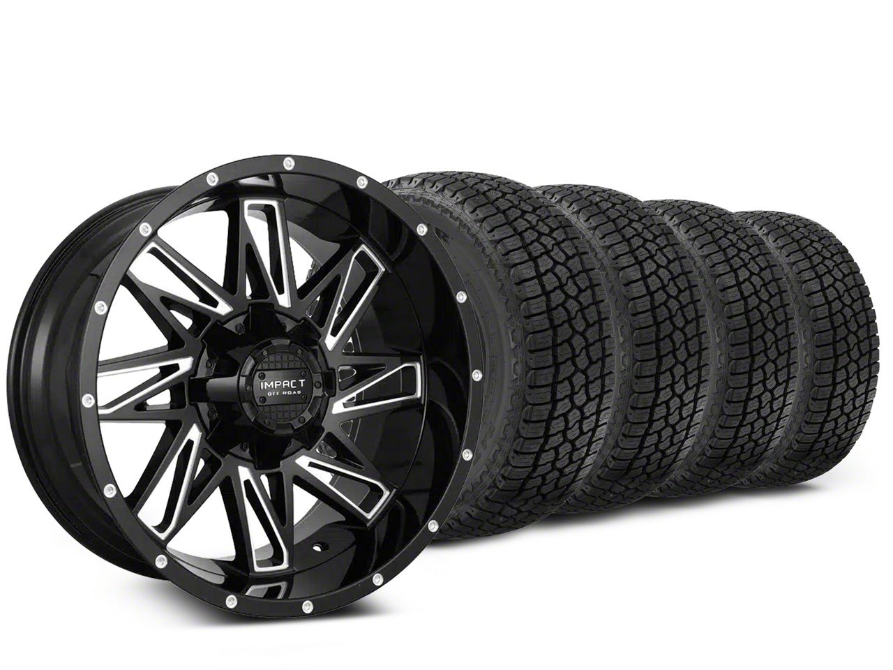 Mounted and Balanced Wheel and Tire Kit. This wheel and tire combo kit features (4) 17x9 Impact Wheels 814 Gloss Black Milled 5-Lug Wheels and (4) Milestar All-Terrain Patagonia AT/R 33" - 285/70R17 tires that have been put together into an easy to buy kit that arrives to your door already mounted and balanced ready to be installed on your vehicle.