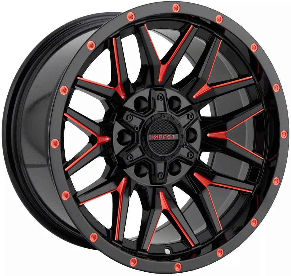 Impact Wheels 819 Gloss Black and Red Milled 5-Lug Wheel; 17x9; -12mm OffsetThis wheel features a sleek and durable design, ideal for enhancing the aesthetic and style of your vehicle. Its quality craftsmanship ensures a perfect combination of form and function, suitable for any driver seeking a balance of style and dependability. Its high-quality finish ensures resistance against corrosion and wear over time. Designed for optimal visual appeal, this wheel complements a variety of vehicle styles.