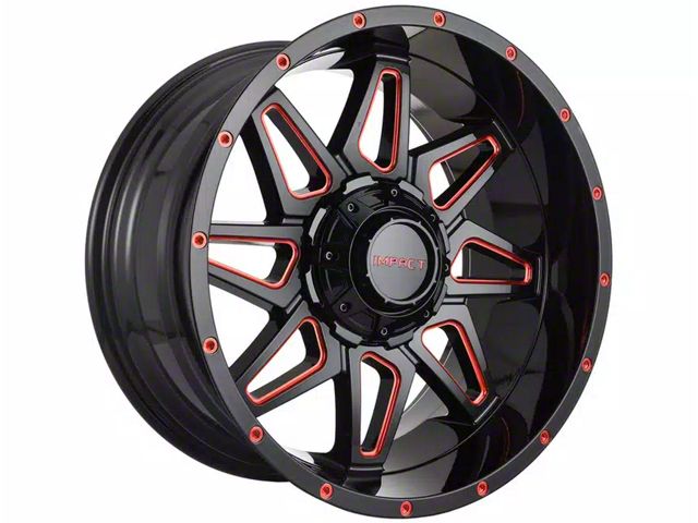 The 20x10 Impact Wheels 807 Gloss Black and Red Milled 6-Lug Wheel is completed in a high-quality gloss black finish with red milled accents. There's a durable clear coat that looks amazing and protects the wheel against the rigors of driving.