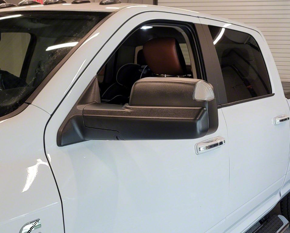 Enhanced Visibility. Elevate your RAM 1500's visibility and functionality with Infotainment Power Folding Towing Mirrors; Textured Black. With the touch of a button, you can retract the mirrors to make tight parking spaces or narrow trails more manageable, preventing potential damage. These mirrors are designed to not only improve your view of the road but also provide added convenience for towing and maneuvering.