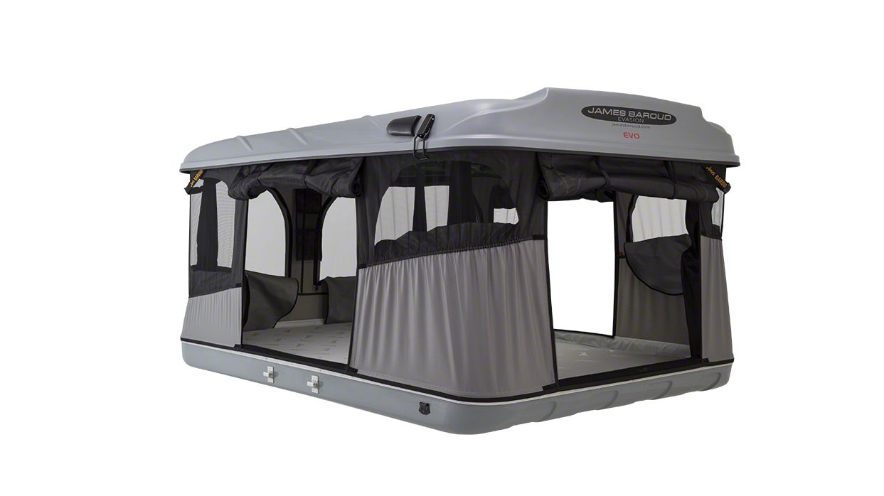 Premium Roof Top Tent. The JAMES BAROUD Evasion Roof Top Tent offers a medium-sized, spacious sleeping area designed for comfort and convenience. It features a high-density foam mattress for restful sleep and integrated windows for excellent ventilation.