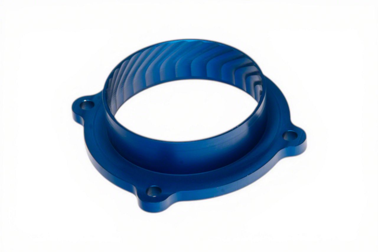 Tough Aluminum Construction. This throttle body spacer is made from billet aluminum, with the highly-effective design milled into the bore to produce a smoother air flow. This spacer comes anodized in blue for a tougher and more durable surface.