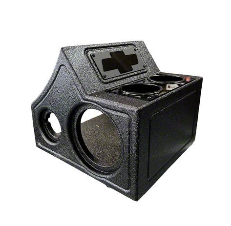 Construction and Appearance. Crafted from durable ABS plastic and finished with a charcoal sprayed coating, this half console offers both strength and style. The precision-molded speaker cutouts feature smooth, rounded edges to accommodate audio components without interference, while the textured finish resists scratches and fingerprints. An embedded Chevrolet acrylic badge adds an authentic OEM accent, blending factory branding with aftermarket functionality.