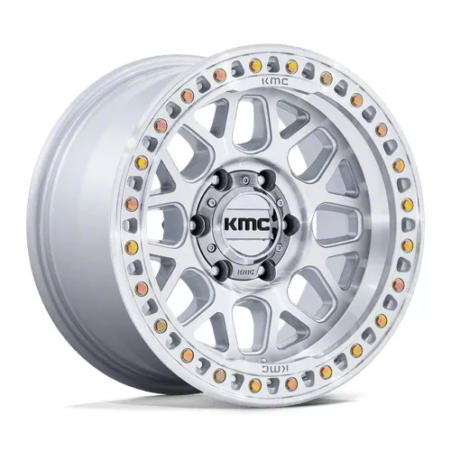 KMC GRS Gloss Silver with Machined Face 8-Lug Wheel; 17x9; -12mm Offset is a perfect blend of style and rugged design, making it a standout choice for those looking to enhance their vehicle's aesthetic appeal. Its bold, dark metallic finish pairs seamlessly with a wide variety of vehicle styles, offering both modernity and durability. Built by KMC, this wheel is designed to elevate your vehicle's appearance with its robust presence.