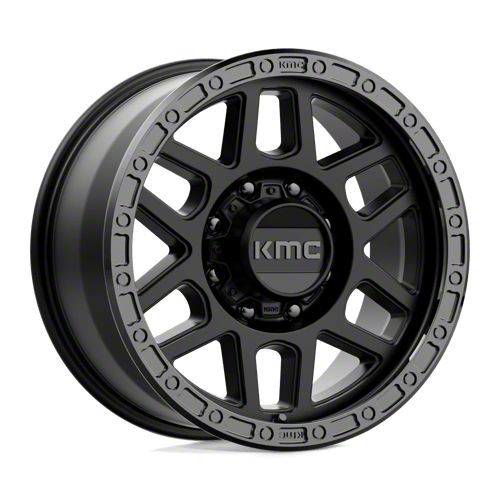 KMC Mesa Satin Black with Gloss Black Lip 8-Lug Wheel; 18x9; 18mm Offset exudes a captivating aesthetic appeal that seamlessly complements various vehicle styles. The craftsmanship of KMC ensures a robust and premium feel, making it a standout choice for discerning drivers.