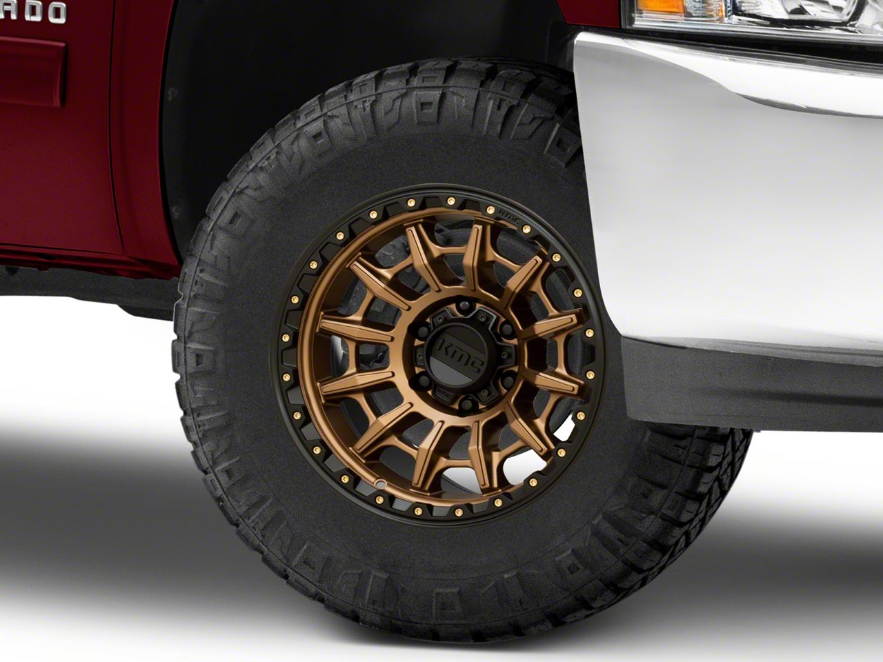 Application. This KMC Carnage Matte Bronze with Black Lip 6-Lug Wheel; 17x9; 0mm Offset with a backspace of 5 Inch, 127mm and bolt pattern of 6 x 139.7mm (6 x 5.5-Inch) ensures impeccable alignment and unmatched driving stability. Specifically designed for 07-13 Silverado 1500 models, each wheel is sold individually.