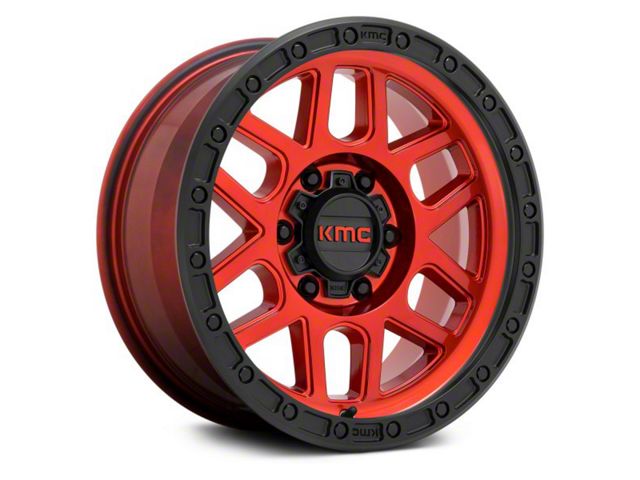 KMC Mesa Candy Red with Black Lip 8-Lug Wheel; 18x9; 18mm Offset offers a striking balance between style and durability. The design speaks to the brand's commitment to quality, enhancing the vehicle's appearance with its distinct look. This wheel, with its unique aesthetics, is ideal for drivers who appreciate a blend of modern design and robust functionality.