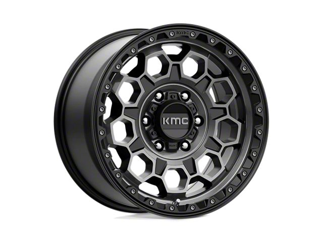 KMC Trek Satin Black with Gray Tint 6-Lug Wheel; 17x9; 18mm Offset The KMC Trek Satin Black with Gray Tint 6-Lug Wheel combines a sleek, sophisticated design with premium construction that enhances the visual appeal and complements a wide range of vehicle styles. This wheel is perfect for those seeking to make a bold statement while maintaining elegance and robustness.
