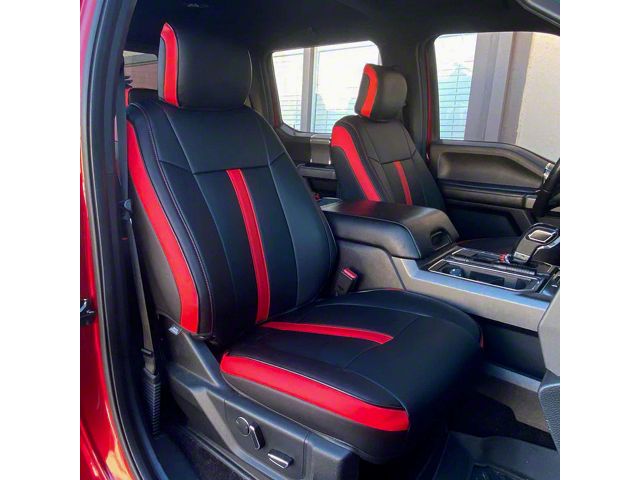 Sporty Design. Made for the Ford F-250 Super Duty SuperCab and SuperCrew models, these Kustom Interiors Premium Artificial Leather Seat Covers have a racing-inspired sporty design with a matte black finish and racing red wing accents.