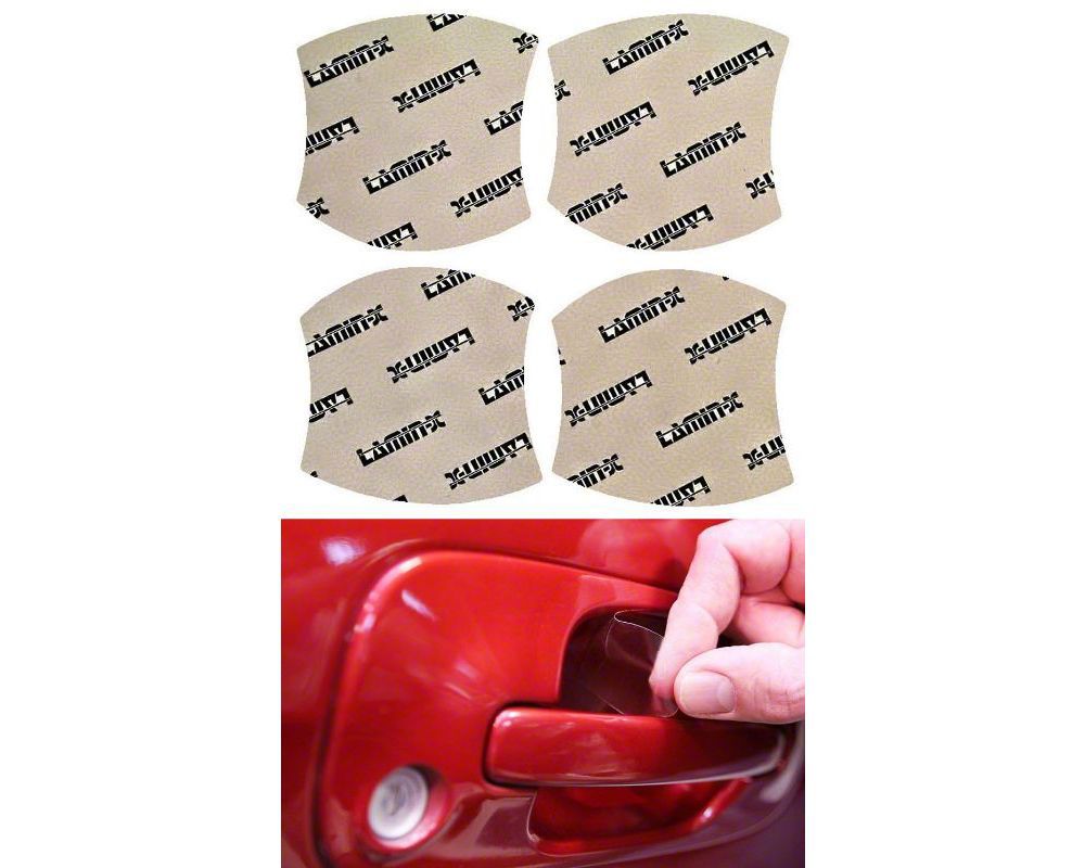 Design. The Lamin-X Door Handle Cup Paint Protection Film comes off easily and without leaving any sticky residue if you decide to remove it for any reason. Your door handle cups will continue to look exactly as they did before you applied the film. This design ensures that you can modify your protection needs as you see fit, without leaving any markings or suffering any damage.
