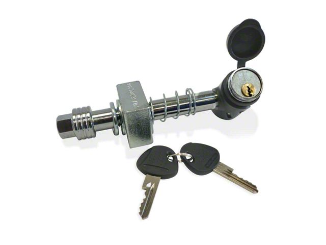 Construction and Appearance. Built with durable materials, the hitch pin features a heavy-duty 90-degree lock with a nylon jacket and a rubber dust cover for added durability and protection against the elements. Its corrosion-resistant design ensures long-lasting use, while the sleek rubber-capped keys add a refined touch.