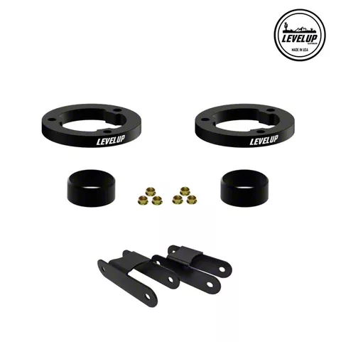 Reliable Elevation. Transform your Canyon with the Level Up Suspension 2-Inch Front / 1-Inch Rear Suspension Lift Kit. The kit provides a 2-inch lift in the front and a 1-inch lift in the rear, resulting in a more aggressive stance and improved ground clearance. This lift allows for larger tires and enhances your Canyon's ability to tackle rough terrain, making it ideal for off-road enthusiasts or anyone looking for a more commanding presence on the road.