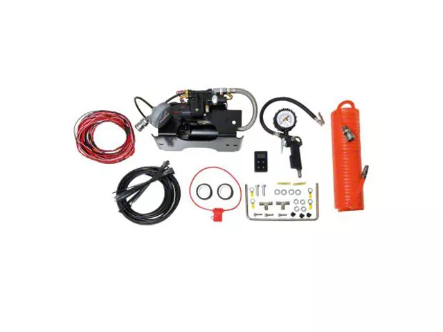Construction and Appearance. This kit features robust, high-quality air bags paired with push-to-connect air fittings for easy installation and reliable performance. The compressor, built for exterior mounting, boasts a maximum working pressure of 120 PSI and is designed to withstand harsh conditions.