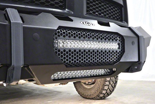 Construction and Appearance. Made from high-quality steel, this bumper is built for durability and strength. The durable black textured powder-coat finish adds a sleek and tough look to your truck. The bumper includes a center screen section and a 20-inch LED light bar, enhancing both the aesthetic and practical aspects of your vehicle.