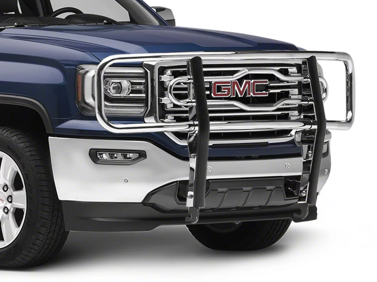 Boosts Truck with Protection and Style. These 2-Inch Tubular Grille Guard – Chrome is both aesthetically and functionally enhancing to the GMC Sierra 1500. Made of robust carbon steel—and featuring securely bolted rubber extrusions and frame-mounted uprights for improved rigidity and structural support—this accessory will protect your truck’s grille against the nastiest of front collisions. And thanks to its bright chrome plating and contoured horizontal tubes for revealing the signature vehicle logo, your Sierra will possess that reinvigorating customized aura.