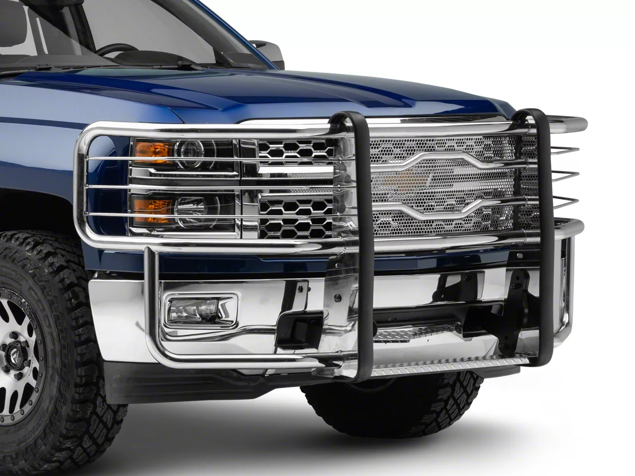 Spruces Up Truck with Protection and Style. Boost both the functionality and exterior profile of your Chevrolet Silverado 1500 with these Prowler Max Grille Guard - Polished Stainless. This item keeps your front grille protected in the rumble-and-tumble outdoors: thanks to a heavy-gauge punched-steel screen, frame-mounted steel uprights, and a heavy-duty wraparound ring design with 3/8-inch wires especially for the headlights. Plus, a contoured logo finishes the overall sharpness that this grille guard will bring to your beloved truck.