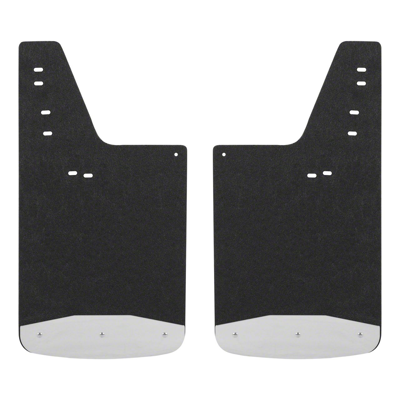 Construction. This pair of Textured Rubber Front or Rear Mud Guards are made of 3/8-inch thick recycled rubber flaps, which offer some flex, but also ward off scrapes. The textured rubber surface keeps up a clean appearance. There are high-polish, 18-gauge stainless steel plates and high-strength steel brackets round off the beauty of the guards. These guards measure 12 inches x 23 inches.